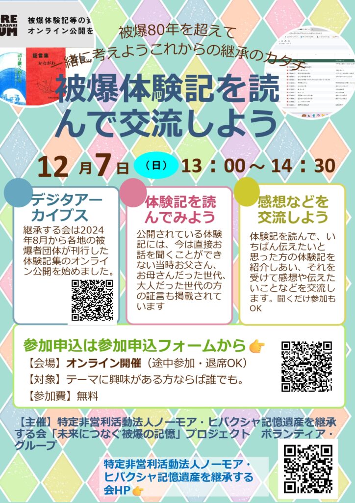 【主 催】ノーモア・ヒバクシャ記憶遺産を継承する会継承する会「未来につなぐ被爆の記憶プロジェクト」ボランティア・グループ