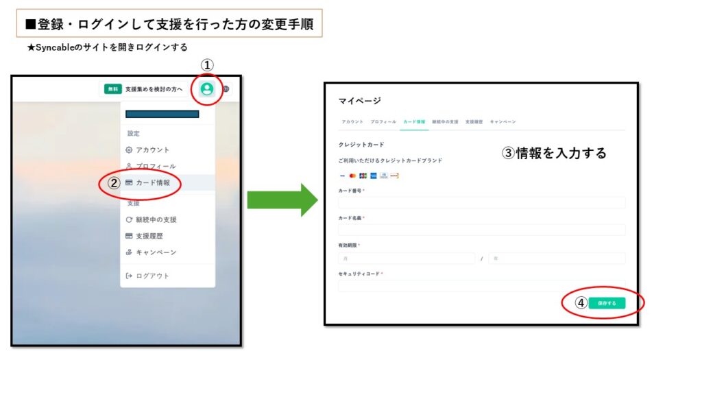 クレジットカードの変更方法は、支援時にSyncableに会員登録して行ったか、メールアドレスのみで支援したかで異なります。ご注意ください。
