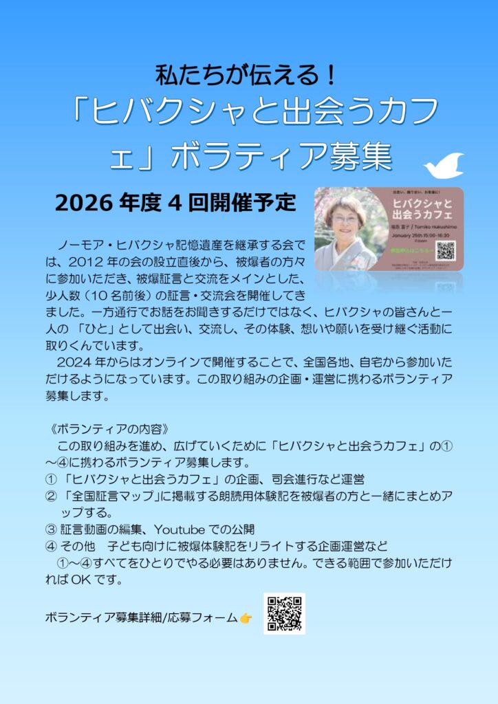 この取り組みを進め、広げていくために「ヒバクシャと出会うカフェ」の①~④に携わるボランティア募集します。